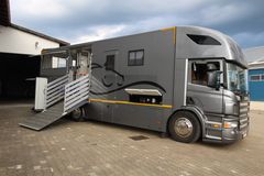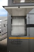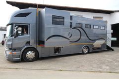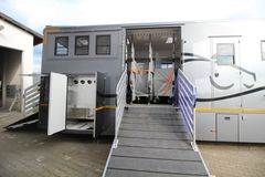 5 Pferdestellplätze mit Trennwänden in Edelstahlausführung, Beißschutz, Futtertrog mit großem aussenliegendem Stauschrank, Deckenablage, großes Ausstellfenster, Abspritzanlage für die Pferde, Heck- und Seitenrampe.